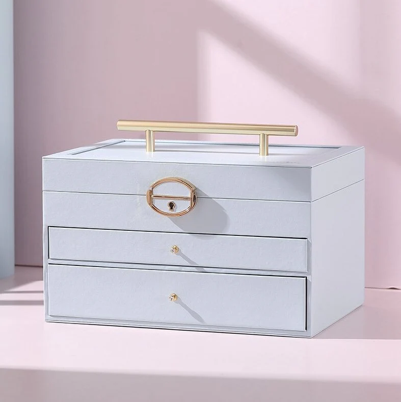 Adoptieren Sie dieses Schmuckkästchen Blau, das sehr hübsch aussieht und mit seinem Tragegriff aus goldfarbenem Messing sehr praktisch ist. Wenn Sie nicht genug Schmuck haben, haben Sie hingegen dank der vielen Fächer in der Schachtel genug Platz. In den herausnehmbaren und einziehbaren Schubladen können Sie Ihre Kosmetika, Armbänder oder Schmuckstücke aufbewahren. Sie verfügen über einen speziellen Uhrenplatz, der ebenfalls mit einem kostenlosen Polster ausgestattet ist. Die Halsketten sind gut geschützt und können sich nicht verheddern. Und nutzen Sie den Beistellspiegel, um die Accessoires zurechtzurücken und an ihren Platz zu bringen.