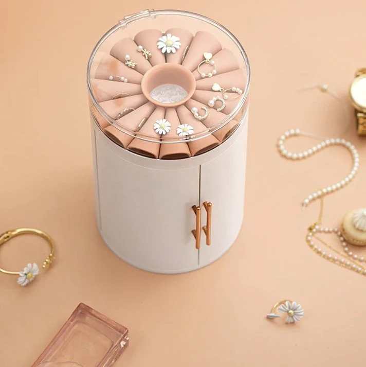 Diese designer schmuckkästchen ist einzigartig und stilvoll. Wenn Sie eine Sammlung von Halsketten oder Sautoirs haben, sind Sie hier gut bedient, denn es gibt viele Haken, um sie aufzuhängen. Es gibt 30 davon. Natürlich gibt es mit den 4 herausnehmbaren Schubladen auch noch viel Platz für andere Sets wie Ringe, Ohrringe, Uhren oder Kosmetika. Die zylindrische Form mit den beiden Öffnungsmanschetten ist sehr dekorativ. Der Deckel ist aus transparentem Material, das den Blick auf Ihre Schmuckstücke freigibt.