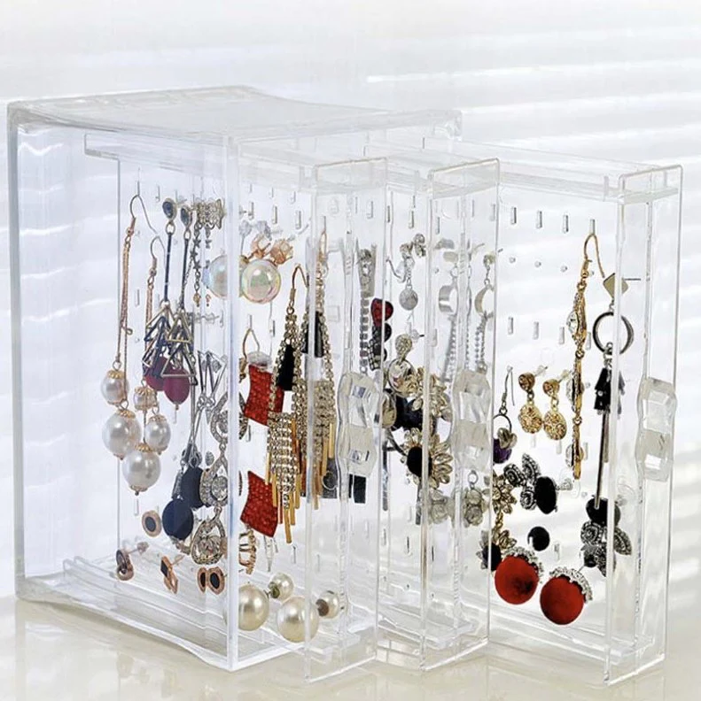 Es ist sehr hübsch, dieses Schmuckkästchen durchsichtig. Es ist speziell für Sie gemacht, wenn Sie Ohrringe lieben, denn Sie haben 72 Fächer für diese Wunderwerke. Hier können Sie auch Ihre Halsketten aufhängen, damit sie nicht durcheinander kommen. Keine Sorge, Ihre anderen Schmuckstücke haben auch Platz, denn es gibt noch drei herausnehmbare Schubladen. Das Acrylmaterial sorgt dafür, dass der Schmuck von außen sichtbar ist.