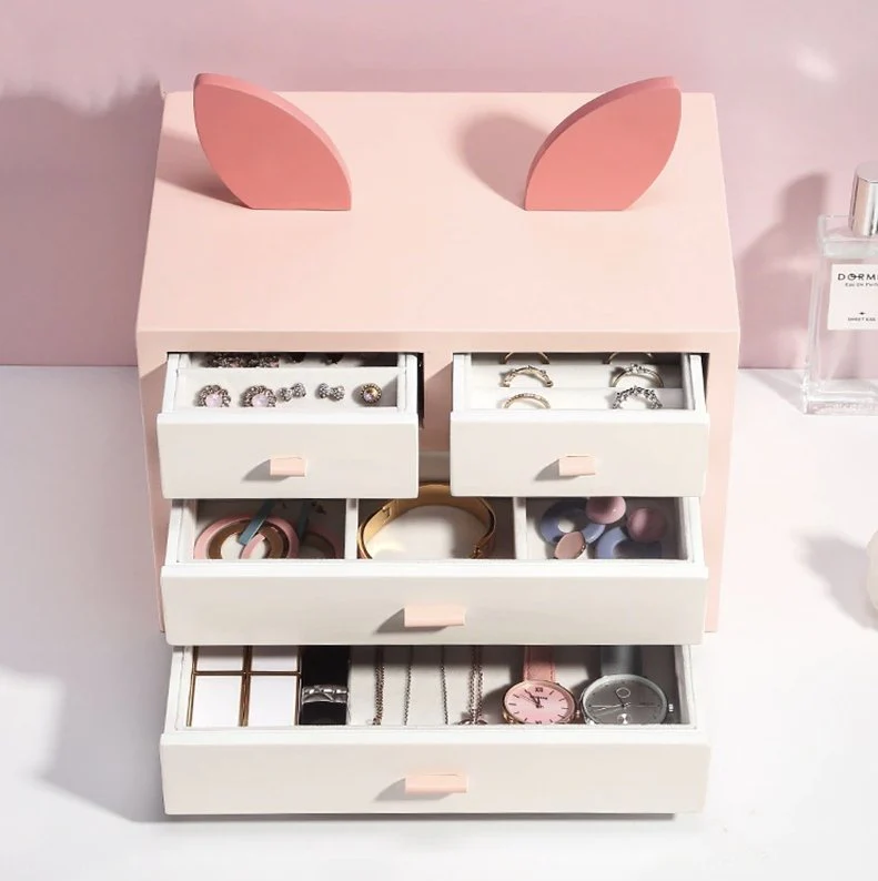 Dieses niedliche Schmuckkästchen Mädchen Holz verfügt über 4 herausnehmbare Schubladen. Die Trennwände können herausgenommen werden, um Platz für ein sehr großes Fach zu schaffen. Die Holzohren sind ebenfalls herausnehmbar. Dieses Schmuckkästchen ist für kleine und große Kinder geeignet. Das Innere ist mit ultraweichem Samt gestaltet, um Ihren wertvollen Schmuck vor möglichen Abnutzungserscheinungen zu schützen. Sie wird ein sehr schönes Accessoire für die weibliche Dekoration sein.