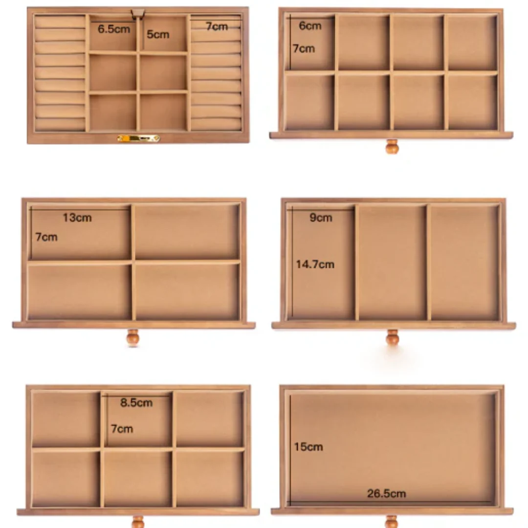 - Organisierte Aufbewahrung: Mehrere Schubladen mit verschiedenen Unterteilungen sorgen für eine präzise und praktische Aufbewahrung Ihrer Accessoires.